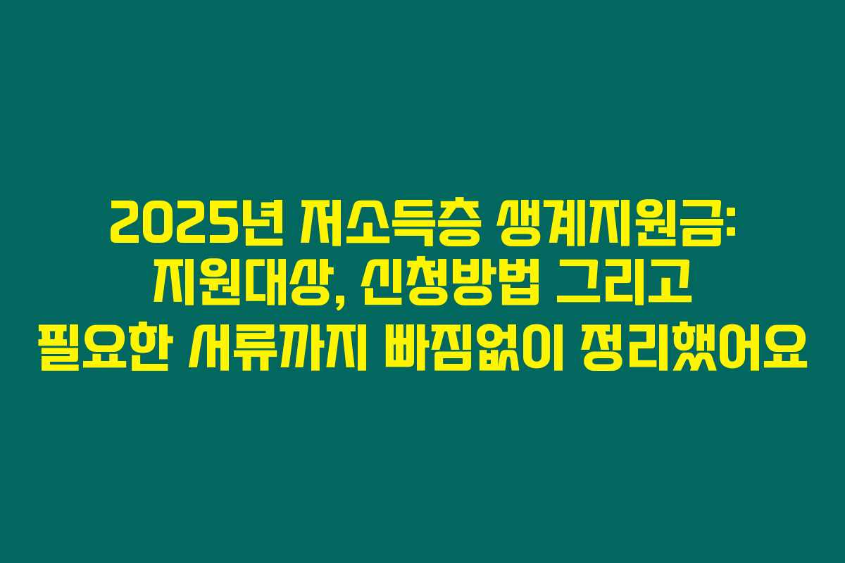 제가 알아본 바로는, 2025년 저소득층 생계지원금은 경제적인 어려움을 겪고 있는 가정에 큰 도움이 되는 프로그램입니다. 여러 지원금들이 있어서 헷갈릴 수 있는데, 아래를 읽어보시면 지원대상, 지원내용, 신청방법, 제출서류 및 신청기간에 대한 자세한 정보를 알 수 있습니다.