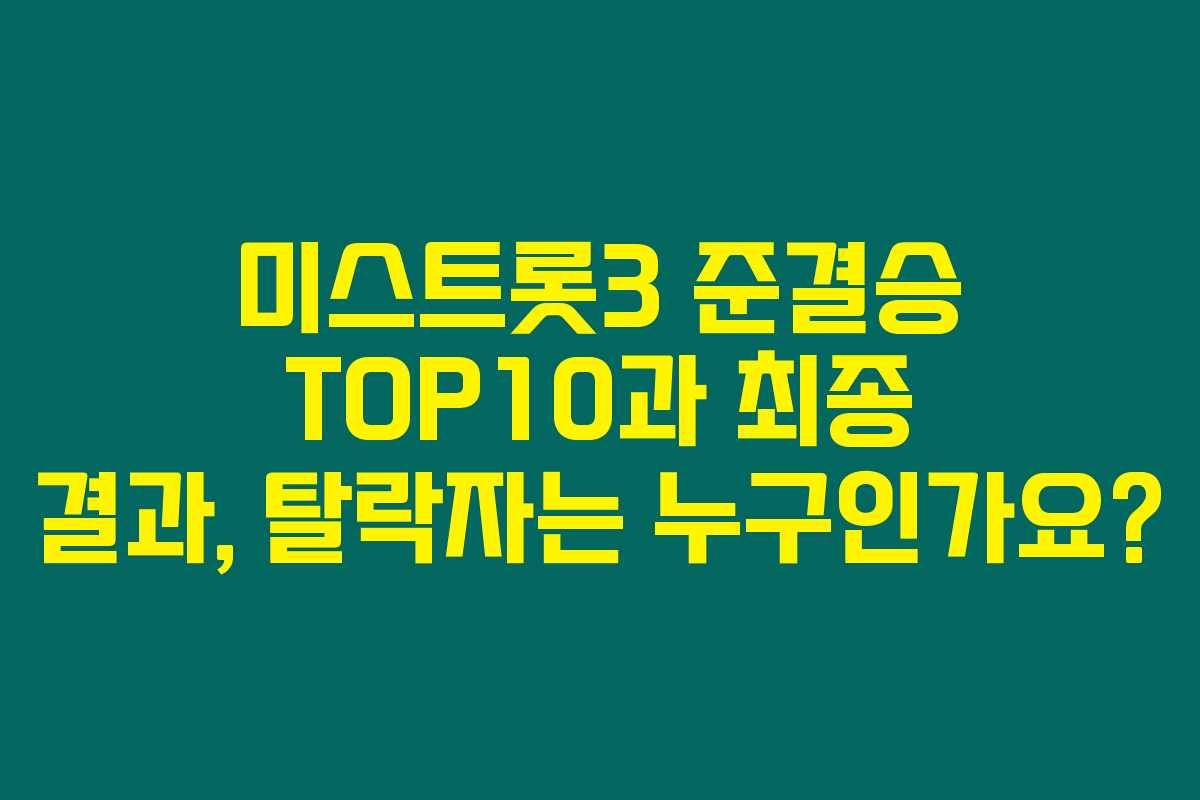 준결승 진출자 명단을 확인하기 전에, 혹시 미스트롯3의 치열한 경쟁을 놓치신 분이 있다면 다음 정보를 꼭 확인해보세요. 미스트롯3의 TOP10 점수 순위와 탈락자 명단은 대회 전개에 큰 영향을 미친 만큼, 여러분의 관심이 집중될 수밖에 없어요. 흥미로운 내용을 아래에서 확인하세요!