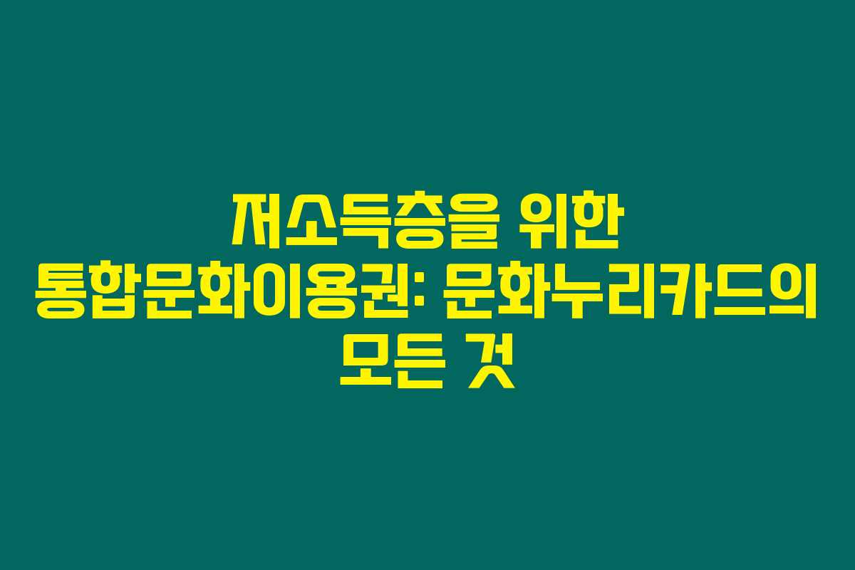 제가 직접 리서치한 바로는, 통합문화이용권인 문화누리카드는 저소득층이 문화생활과 체육 활동을 더욱 쉽게 즐길 수 있도록 돕는 매우 유익한 제도랍니다. 이 카드를 통해 문화예술 분야는 물론 여행과 스포츠와 같은 다양한 활동이 가능해지는데요, 아래를 읽어보시면 이 카드의 지원 내용, 신청 방법 및 이용 방식에 대해 자세히 안내드릴게요.