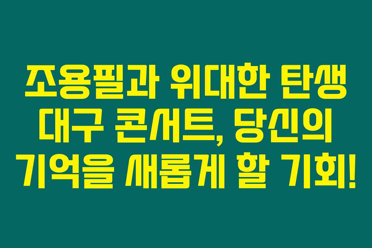 2024년 12월 21일, 전설이 다시 돌아옵니다. 조용필과 위대한 탄생의 대구 콘서트가 열리는데요, 이 특별한 순간을 놓치지 않기 위해 아래를 읽어보시면 다양한 정보를 얻으실 수 있습니다. 티켓 예매에 대한 팁과 함께 콘서트의 의미도 함께 알아보아요.