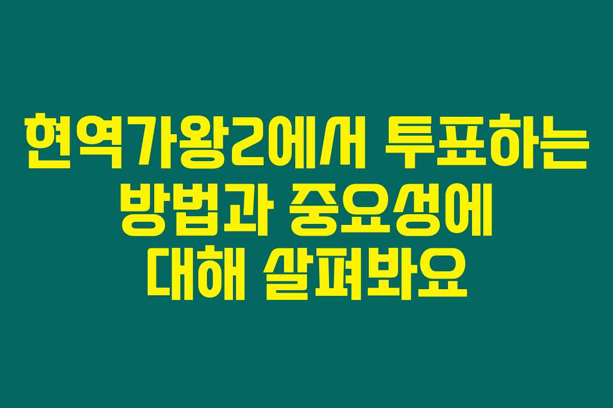 여러분 혹시 현역가왕2에 투표하고 싶은데 방법을 몰라서 고민하고 계신가요? 현역가왕2의 투표는 단순하게 마우스 클릭만으로도 가능합니다. 여러분이 응원하는 가수를 위해 소중한 한 표를 행사할 수 있는 기회이니, 꼭 참여해 보시길 바랍니다. 투표 방법을 잘 알고 나면 많은 도움이 될 거예요. 아래를 읽어보시면 현역가왕2의 투표 방법을 간단히 정리해 드릴게요!